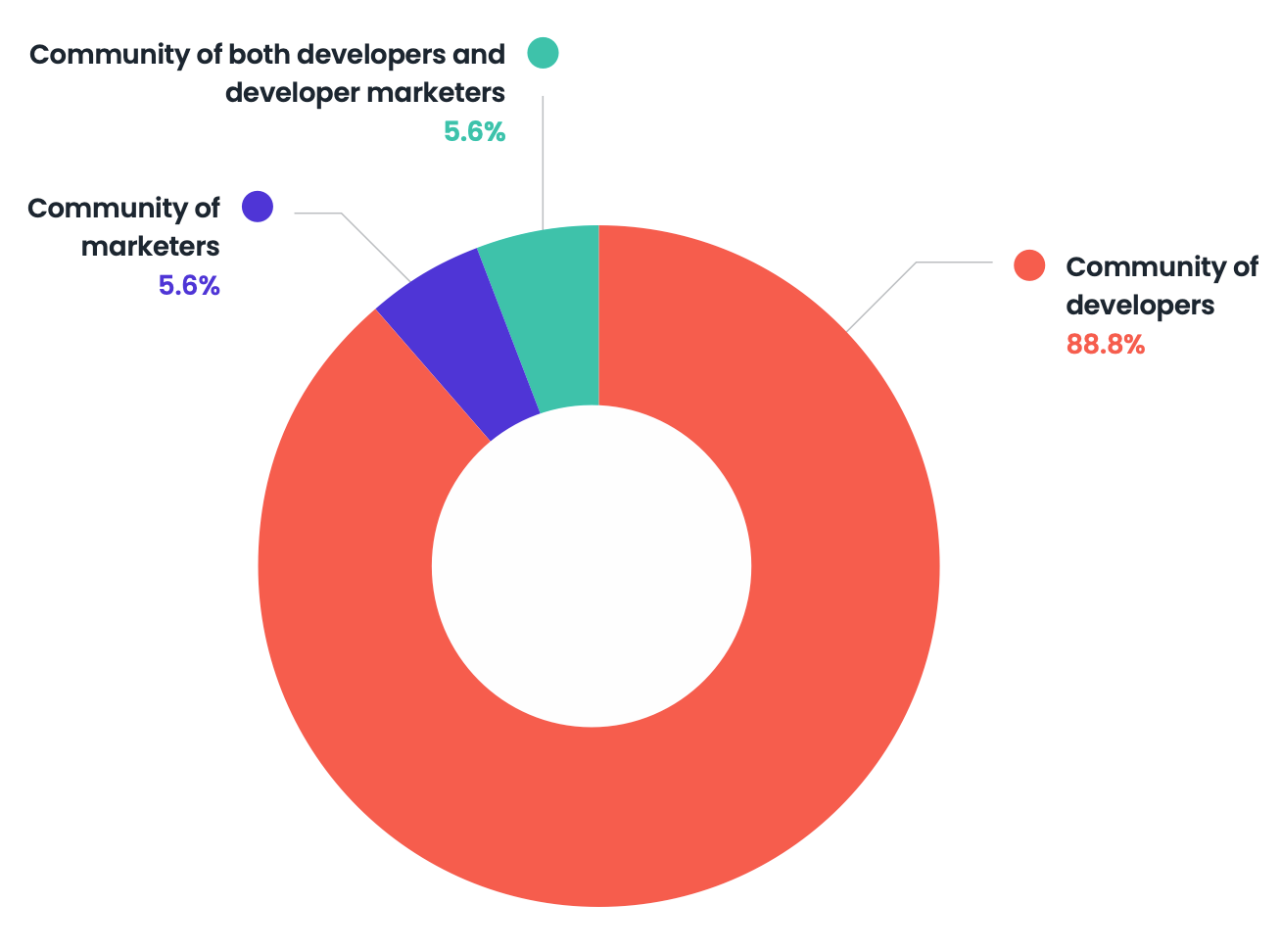 In our State of Developer Marketing Report 2023/24, we found that only 5.6% of respondents who belong to a community said it catered to both developers and marketers. The overwhelming majority (88.8%) of respondents belong to a community of only developers.